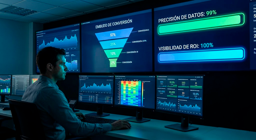 Implementamos infraestructuras de rastreo avanzadas que van mucho más allá de un simple contador de visitas. Conectamos su sitio web, sus plataformas de anuncios y su facturación en un solo ecosistema. Usted no recibirá reportes confusos de clics; recibirá un tablero de control de rentabilidad pura en tiempo real.